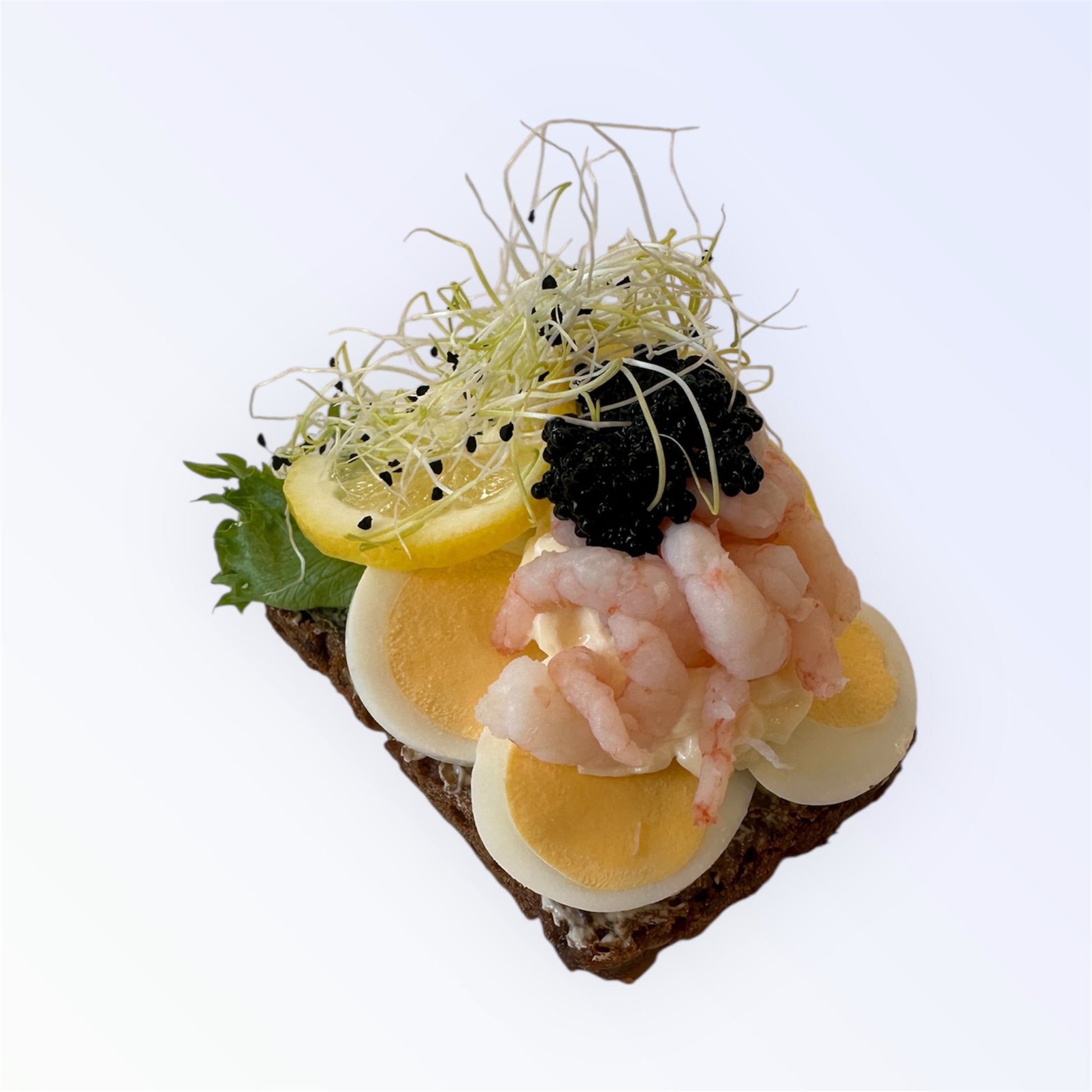 Dette æg og rejer-smørrebrød med sort kaviar, citron og friske grønne elementer en elegant og velsmagende hyldest til den klassiske danske smørrebrødstradition.