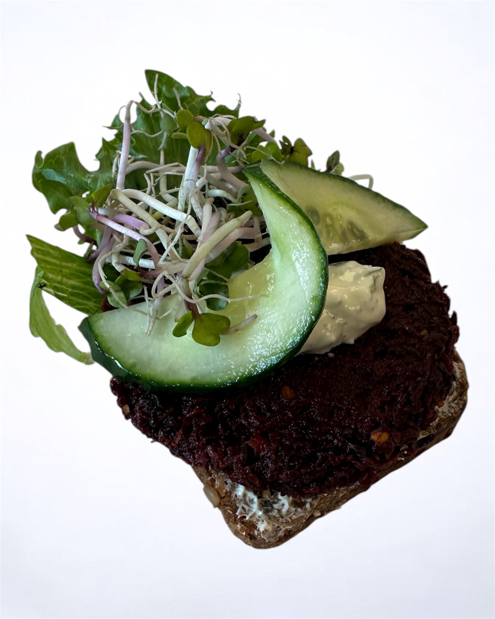 En krydret rødbede bøf med en saftig og let karamelliseret overflade danner midtpunktet, rig på dybe, jordagtige noter og et strejf af varme krydderier. Ovenpå hviler en cremet, plantebaseret "ægge"-topping, der tilfører en blød og mild smag, balanceret af frisk, peberagtig karse. Det hele hviler på en skive solidt, dansk solsikke-rugbrød, hvor de ristede solsikkekerner tilføjer en nøddeagtig dybde og en let crunch. En sand hyldest til den klassiske smørrebrødstradition – men i en moderne, plantebaseret udgave! 🌱